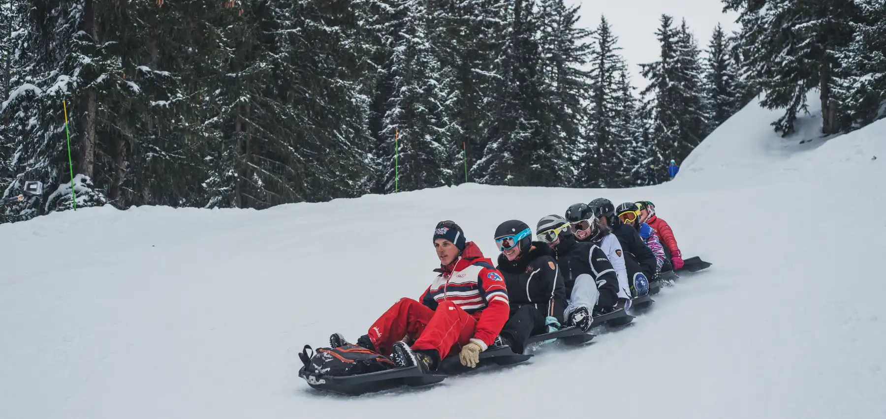 Snake Gliss literally strengthens bonds, because all the participants are linked to each other. But how does it work? The Snake Gliss is actually a line of identical sledges, linked together and piloted by a guide. This unusual arrangement makes it possible to descend snow-covered slopes all together (up to 10 people at a time), in a friendly and lively atmosphere.
